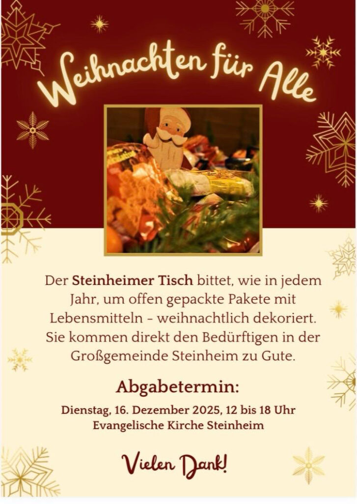 Die Mitarbeiterinnen und Mitarbeiter des Steinheimer Tisches können dann alle Päckchen und Pakete so vorsortieren, dass für jeden ein passendes Paket bereitsteht, so dass auch die Großfamilien ein entsprechend großes Paket erhalten. Am 17. Dezember von 10:35 bis 14:00 Uhr ist dann die „Bescherung“ in der evangelischen Kirche.
